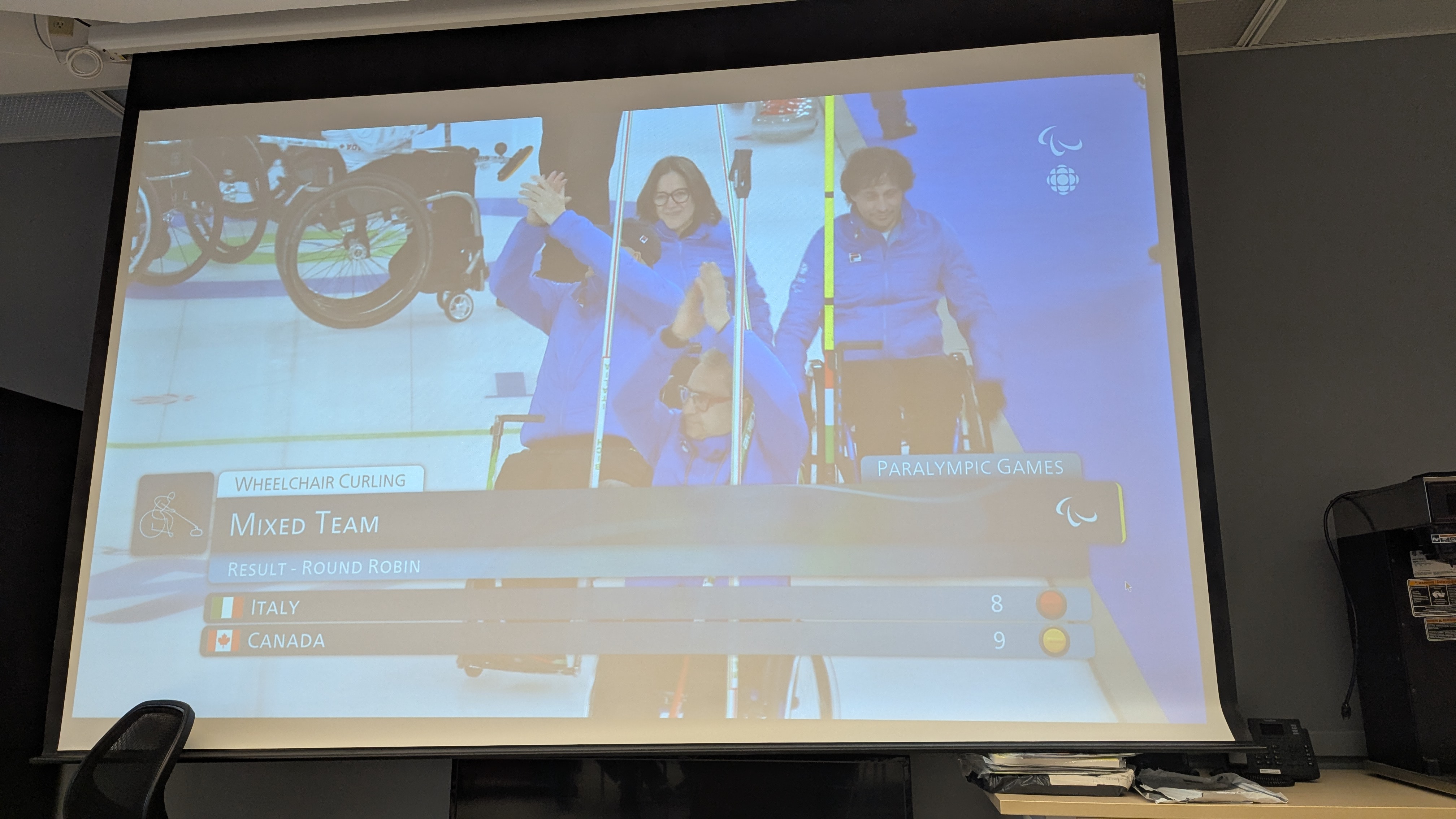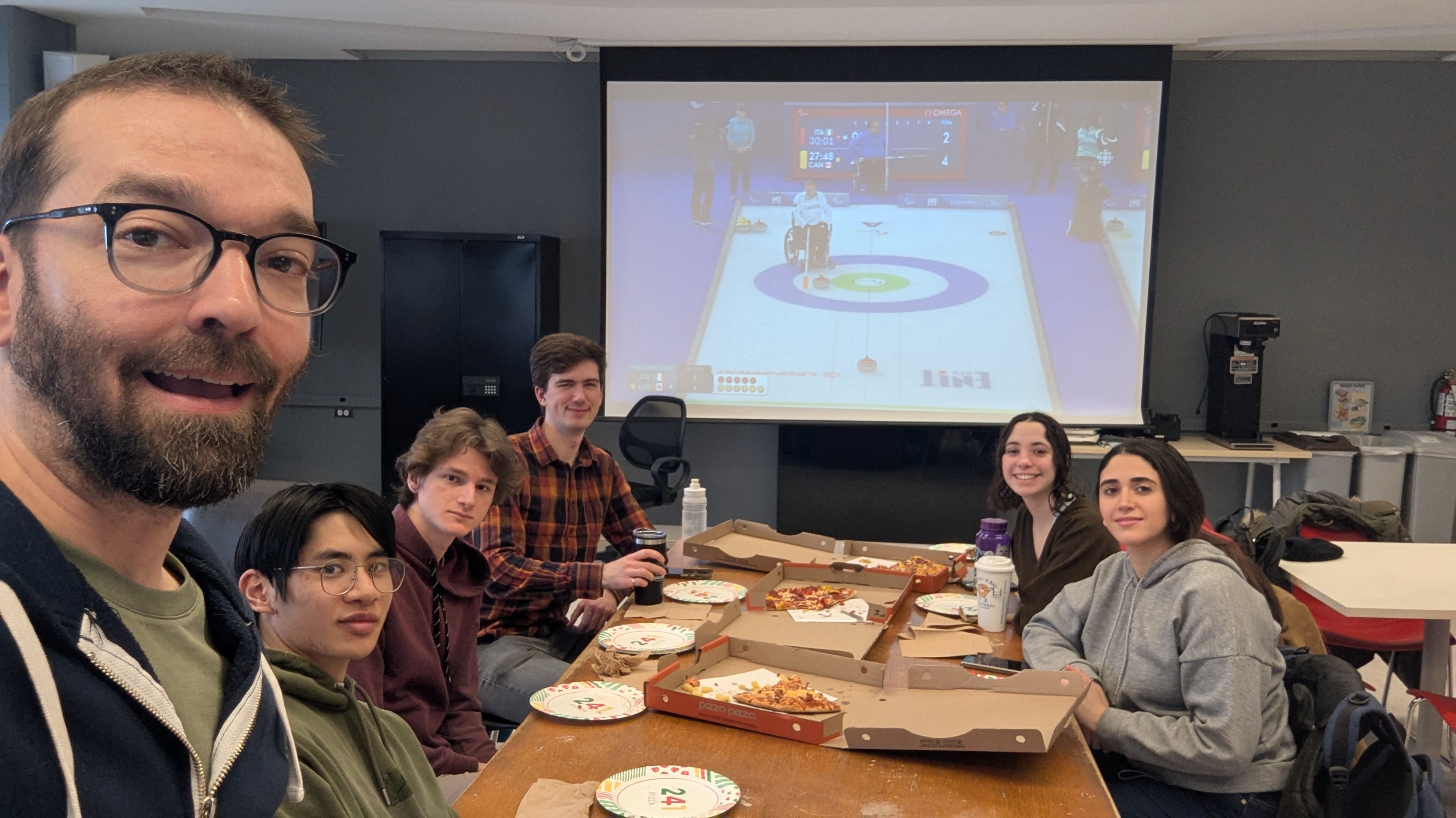 We also got together for just some social time, eating pizza and watching Canada compete at the Paralympics in Wheelchair Curling. The game was very exciting, with Canada taking an early lead and barely hanging onto it as Italy nearly came back in the 10th end. They had to get out a measurement device and Canada won by just a few millimeters!